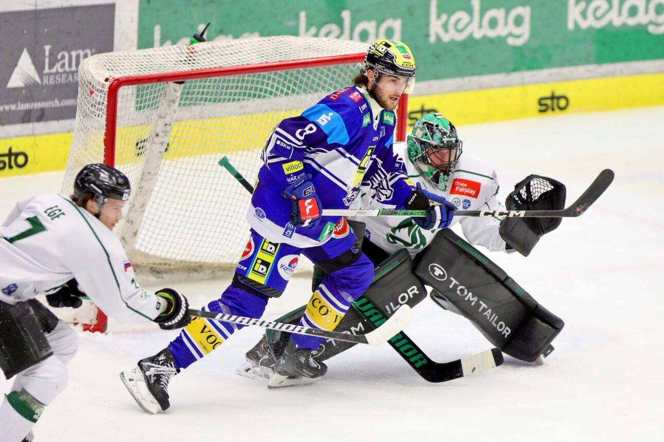 “Blau-Weiß” startete mit viel Energie in den letzten Abschnitt, drückte auf den Ausgleichstreffer. Die “Adler” mussten früh im Drittel aufgrund von Strafen gegen van Nes und Wallenta in doppelter Unterzahl agieren – und prompt stellten die Slowenen durch Bonino auf 3:5. Villach zeigte aber, wie schon so oft in dieser Saison, Moral. Hancock versenkte die Scheibe in der 47. Spielminute im Zuge eines Konters passgenau ins Kreuzeck. Der hohe Forecheck der Slowenen machte den “Adlern” aber zu schaffen, sie produzierten zu viele Scheibenverluste und ermöglichten den Gästen zahlreiche Konterchancen – 9 Minuten vor Schluss verhinderte die Stange einen Treffer. Zu nennenswerten Gelegenheiten kamen die “Blau-Weißen” nicht, glichen 2:56 vor Schluss aber trotzdem aus. Rauchenwald eroberte die Scheibe in der neutralen Zone, legte vor dem Tor quer auf Marco Richter und der verwertete eiskalt zum 5:5-Ausgleich. Was dann geschah, war keineswegs in Worte zu fassen: 1:18 vor Schluss versetzte Kevin Hancock die Villacher Stadthalle in Ekstase. Der Kanadier versenkte die Scheibe aus dem hohen Slot halbhoch in die Maschen. Die “Adler” gewannen zuhause gegen Olimpija Ljubljana mit 6:5.