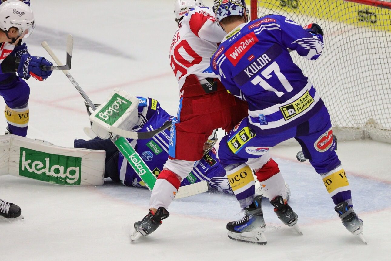 Doch dann kam die folgenreiche 10. Minute: Nach einem Crosschecks wurde Alexander Rauchenwald mit einer fünf Minuten plus Spieldauer-Strafe belegt. Somit war das Match für den VSV-Kapitän vorzeitig vorbei. Aber die Blau-Weißen kämpften verbissen, warfen sich in jeden Schuss der Gäste und überstanden die fünfminütige Unterzahl ohne Gegentreffer. So blieb es nach 20 Minuten bei der Villacher 2:1-Führung.