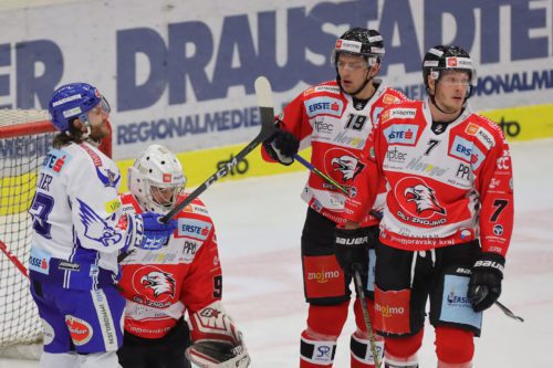 Knisternde Spannung bei den rund 2800 Besuchern schon vor dem Match in der Villacher Stadthalle: Die „Adler“ benötigten bekanntlich einen Sieg in regulärer Spielzeit, um schon vorzeitig ins Play-off einzuziehen. Und die Blau-Weißen waren heiß, starteten überfallsartig mit Top-Chancen durch Markus Schlacher, Jerry Pollastrone und Brodie Reid, doch Znaim-Goalie Dominik Groh konnte mit tollen Paraden gerade noch den Villacher Führungstreffer verhindern. Aber auch die Tschechen blieben im Konter durch Tomas Svoboda und Antonin Bortuta immer wieder gefährlich. In Minute 6 scheiterten wiederum die „Adler“ durch Felix Maxa ganz knapp, der junge Stürmer traf aus spitzem Winkel jedoch nur die Latte. Der VSV gab ganz klar das Tempo vor, doch die Tschechen verteidigten geschickt und befreiten sich immer wieder mit unerlaubten Weitschüssen. In der 12. Minute dann wiederum Pech für die „Adler“ – Chris Collins tankte sich über links durch, doch sein Schuss landete abermals am Torgestänge. Und nur wenige Sekunden die nächste Top-Chance: Anton Karlsson zog auf Groh, wurde jedoch – etwas Foul verdächtig – am Abschluss gerade noch gehindert. Es blieb nach 20 Minuten beim 0:0.